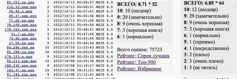 Я, конечно, понимаю, что любые рейтинги вещь относительная. Есть читатели, есть почитатели, есть фанаты, и есть нагонятели рейтингов. Это тоже профессия в наше время, за n-ю сумму ваш самый бездарный сайт выведут в первую десятку по рейтингу. Удержаться там тоже будет стоить денег, и немалых, но это мелочи.